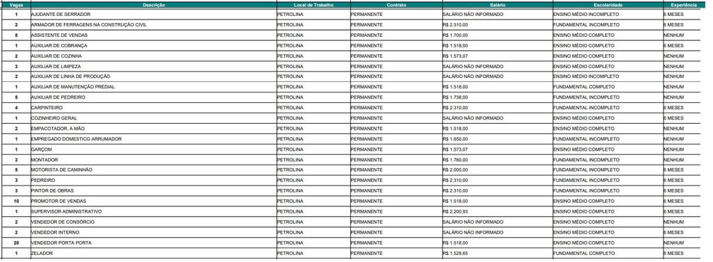 A Agência de Trabalho de Pernambuco divulgou vagas de emprego para esta quarta-feira (22/10), para Petrolina e demais cidades do estado.