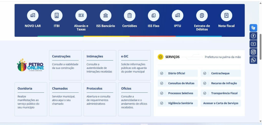 O site da Prefeitura também disponibiliza o Petro Online, que permite consultar a viabilidade de construções, solicitar informações públicas, acompanhar o andamento de ofícios e requerimentos administrativos, verificar a autenticidade de intimações, entre outros serviços. Esse tipo de interação digital não apenas facilita a vida da população, como também otimiza os atendimentos e processos internos da administração municipal.