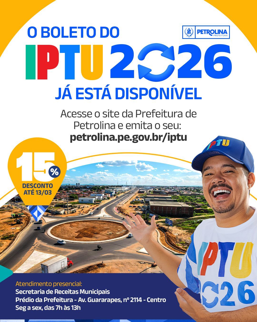Faltam 30 dias para que os contribuintes de Petrolina aproveitem o desconto de 15% no pagamento à vista e antecipado do Imposto Predial e Territorial Urbano (IPTU) 2026. O prazo para garantir o benefício segue até o dia 13 de março. A Prefeitura de Petrolina, por meio da Secretaria de Receitas Municipais, reforça que o pagamento pode ser realizado de forma totalmente digital, com a emissão do Documento de Arrecadação Municipal (DAM) disponível exclusivamente no site oficial do município.